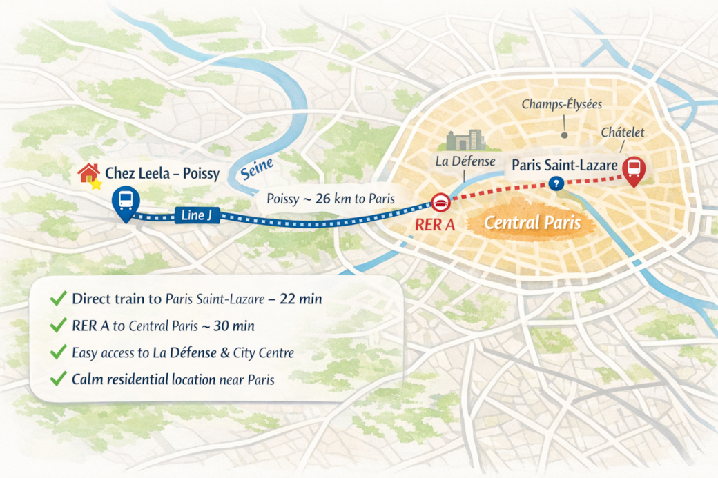 Welcome to Chez Leela, a newly styled, sunlit apartment in the hyper-center of Poissy. Designed for absolute ease, this spotless space delivers the refined standards of a boutique stay with the complete independence of a private home.